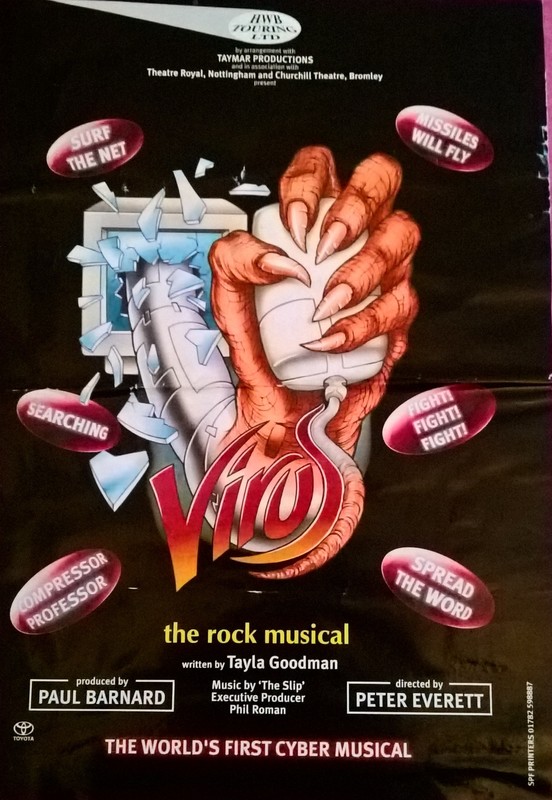 Poster of Virus, a 'cyber-musical', produced by the Theatre Royal in 1999. Show was written by Tayla Goodman, directed by Peter Everett and starred Jack Wild.
