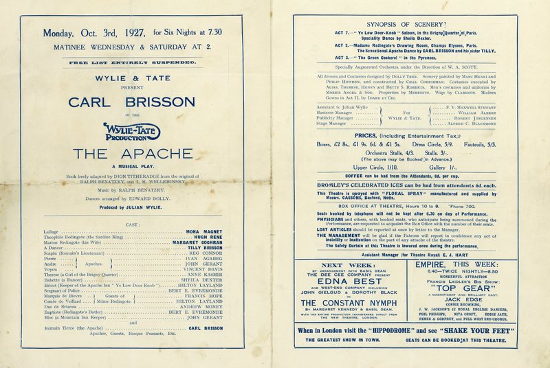 Full programme for the musical play The Apache, starring Carl Brisson.