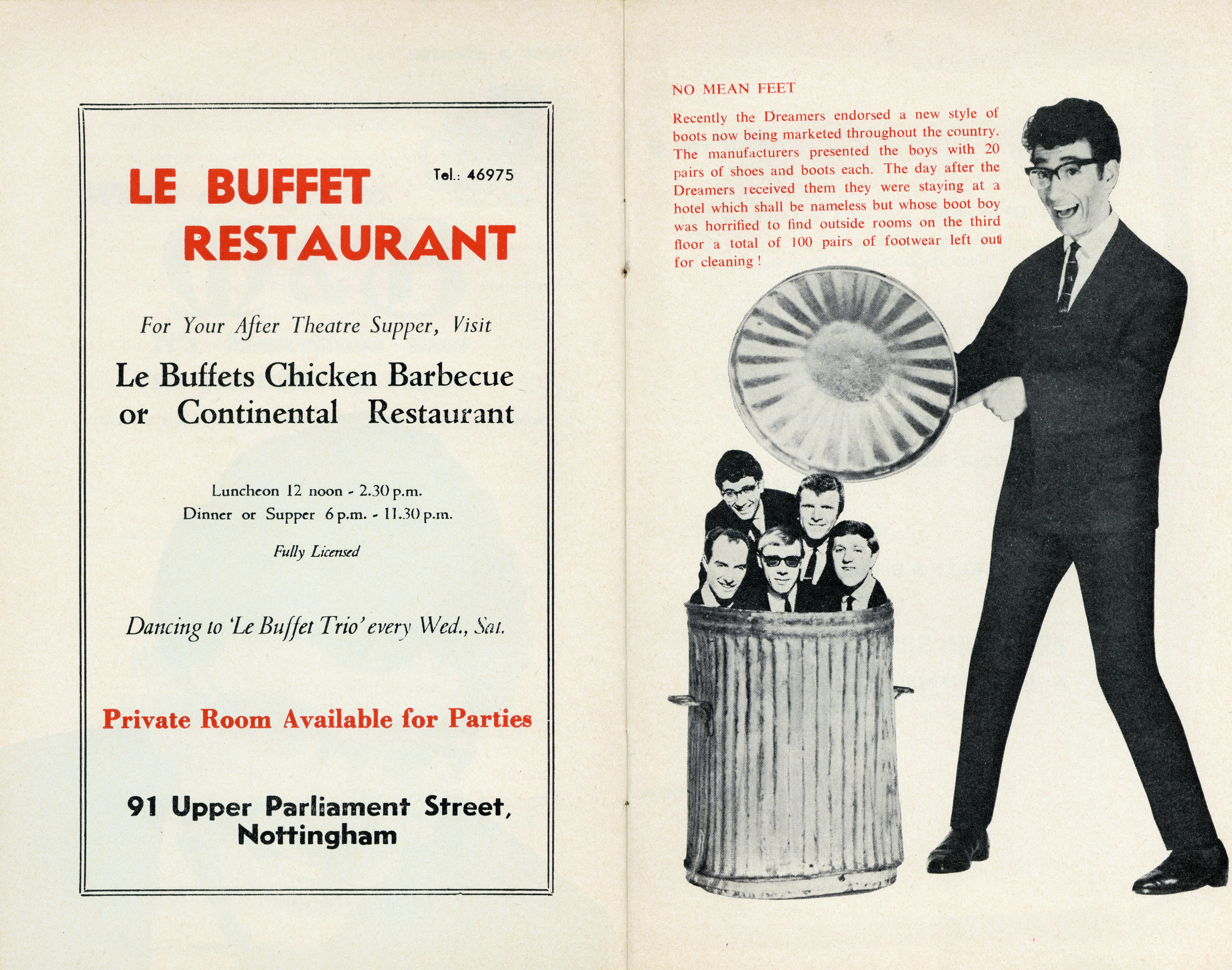It is interesting to note how their show is presented as a typical variety bill for the time, rather than a pop concert we are now familiar with, as also appearing with the band are popular comedian Des O’Connor; Jean and Peter Barbour – Stilt Dancing Puppeteers; George Meaton – The Big Noise and Franklyn and His Doves.