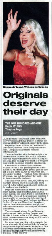 Nottingham Evening Post preview and review of The Hundred and One Dalmatians, starring Toyah Willcox.