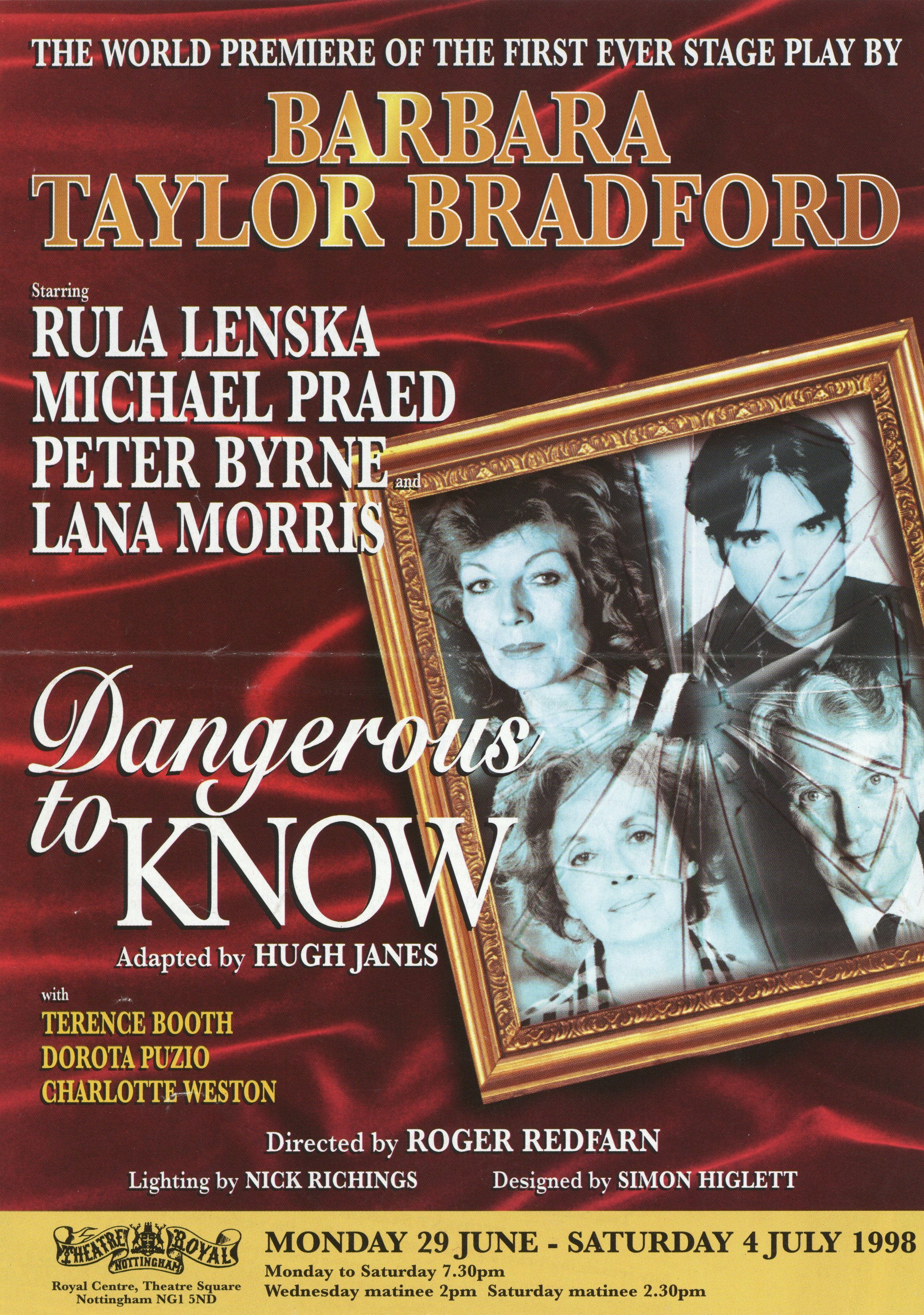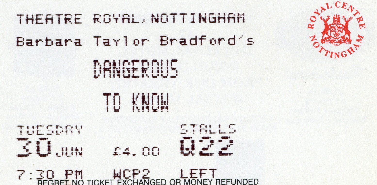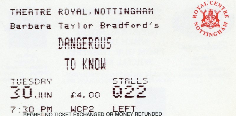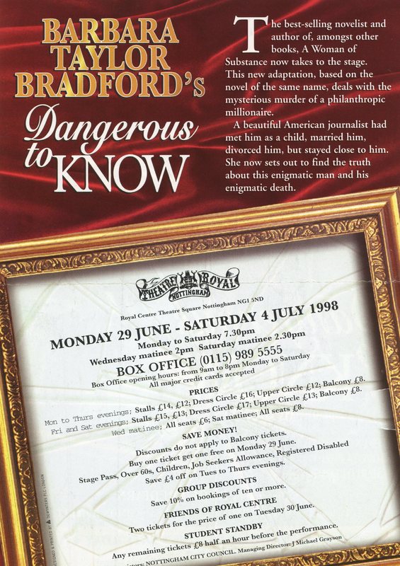 Double-sided leaflet and show ticket for Dangerous to Know, adapted for the stage from the Barbara Taylor Bradford novel by Hugh Janes.
