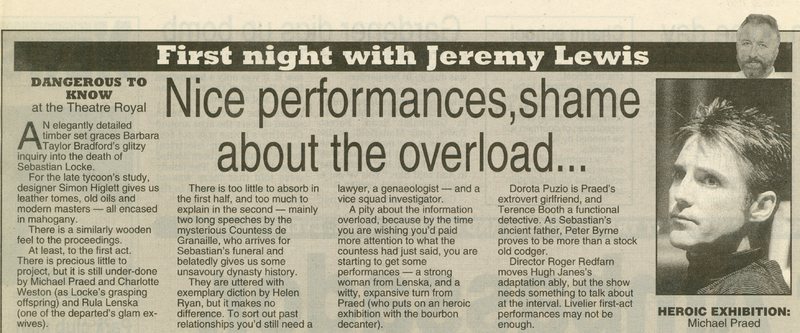 In this review of Dangerous to Know at the Theatre Royal in June 1998, Jeremy provides a typical witty review.