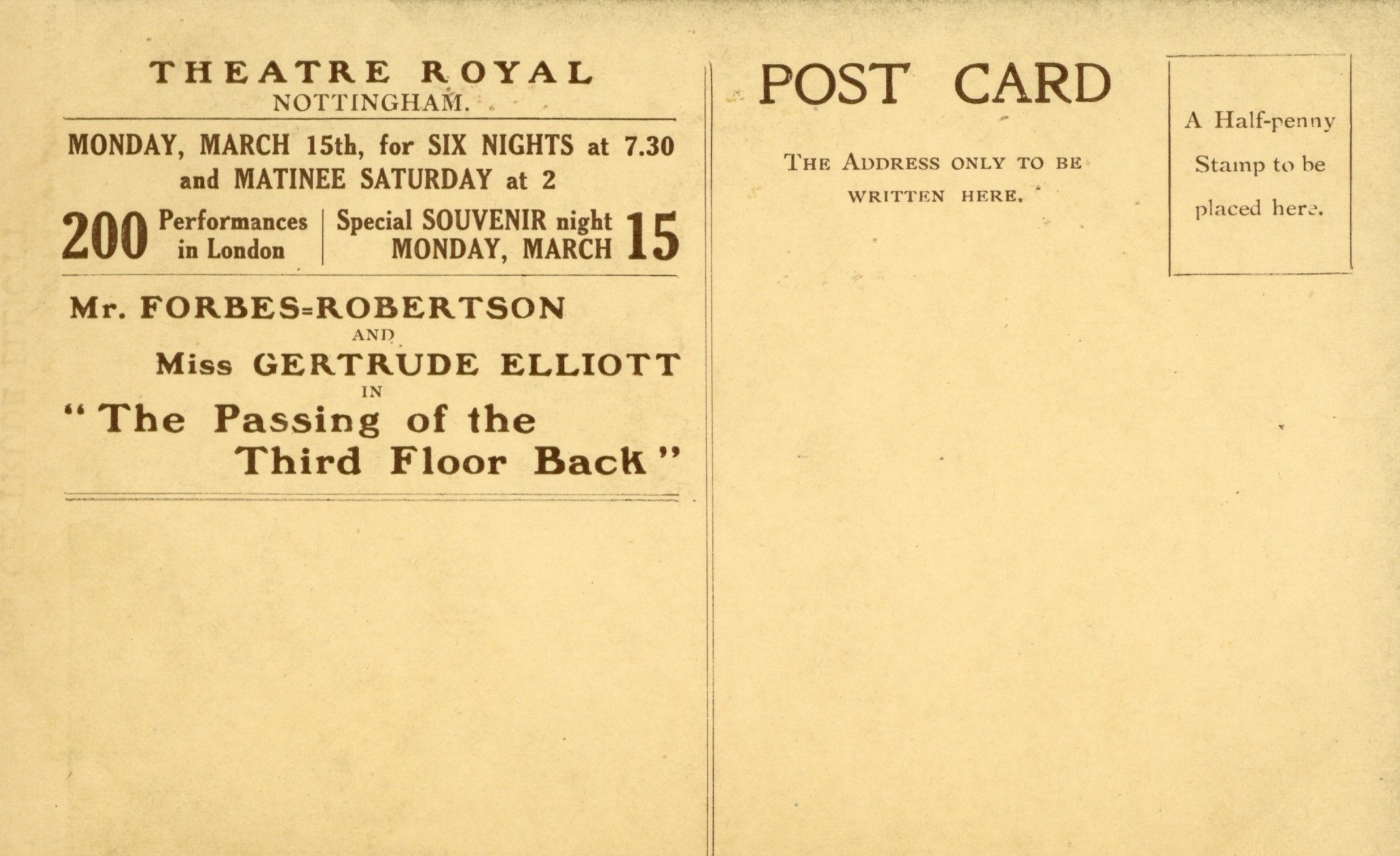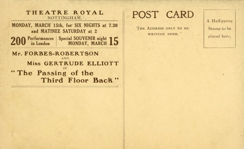Unused postcard for drama The Passing of the Third Floor Back by Jerome K Jerome and starring Johnston Forbes-Robertson and Gertrude Elliott.