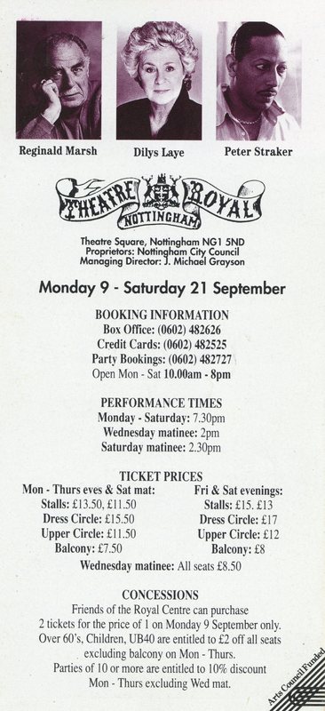 This leaflet has been made available as a loan to the Theatre Royal for digitisation and uploading to the archive by the Wilson family in Nottingham. Their collection of Theatre Royal ephemera relates from 1980 to 2000. This was a period of regular theatre visits, inspired by their youngest son, described as “the driving force” for seeing so many shows at the venue.