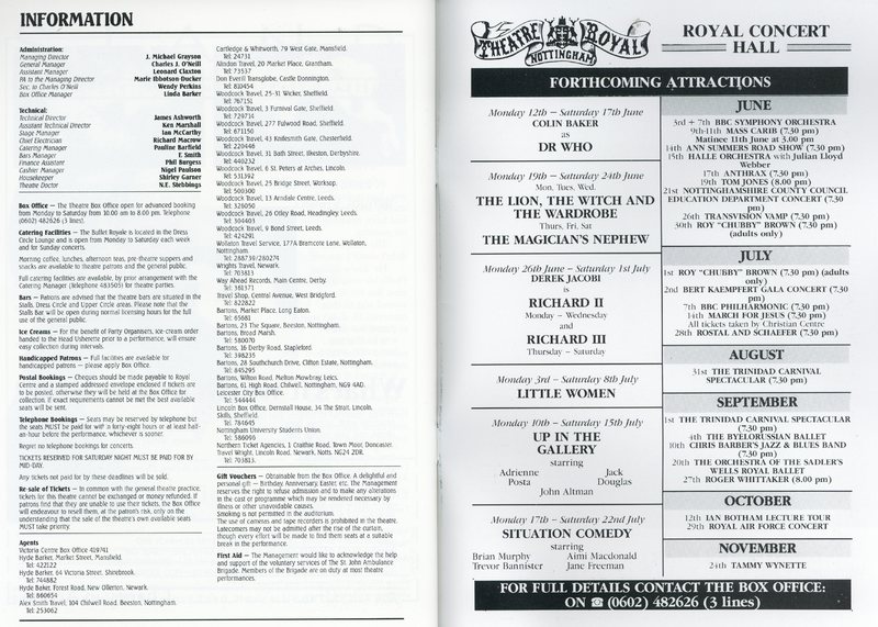 This programme has been made available as a loan to the Theatre Royal for digitisation and uploading to the archive by the Wilson family in Nottingham. Their collection of Theatre Royal ephemera relates from 1980 to 2000. This was a period of regular theatre visits, inspired by their youngest son, described as “the driving force” for seeing so many shows at the venue.