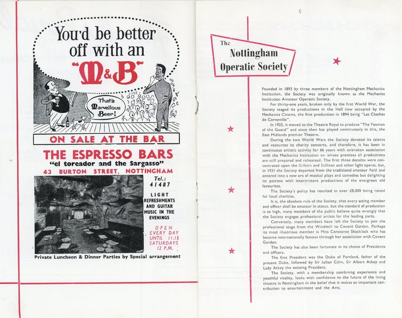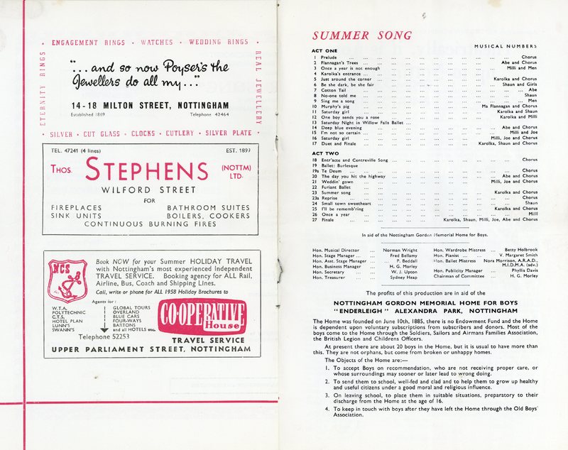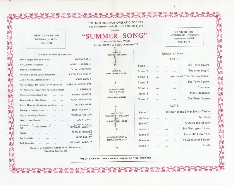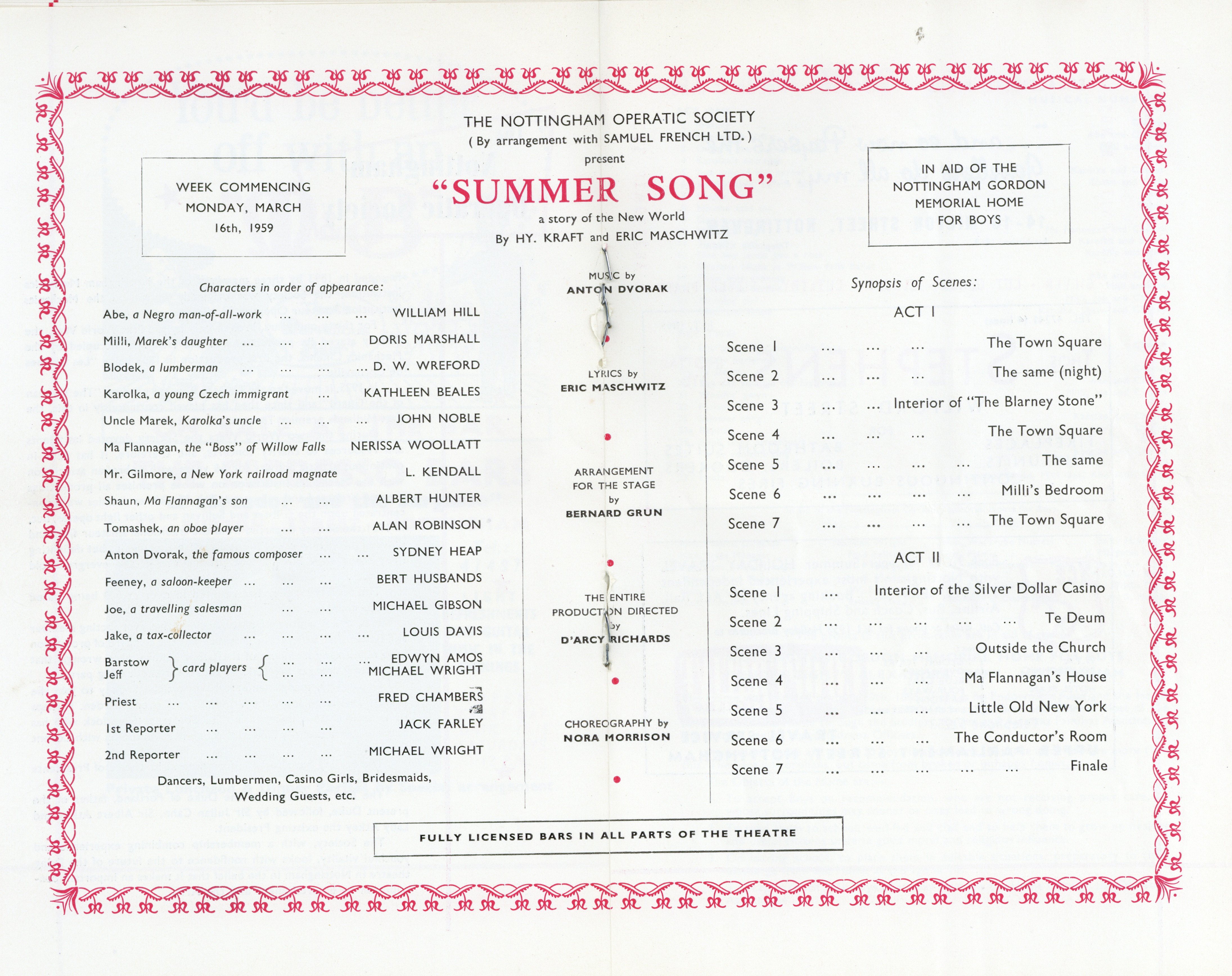 Full programme for Nottingham Operatic Society production of Summer Song, a musical based on the work of Dvorak.