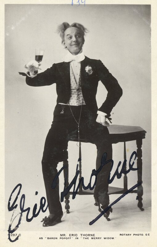 Eric Thorne, was a renowned singer and actor in musical theatre and comic opera who had started his professional career in 1884 with the D’Oyly Carte Opera Company. He later became known for starring roles in tours of Edwardian operettas and musical comedies, such as The Merry Widow.