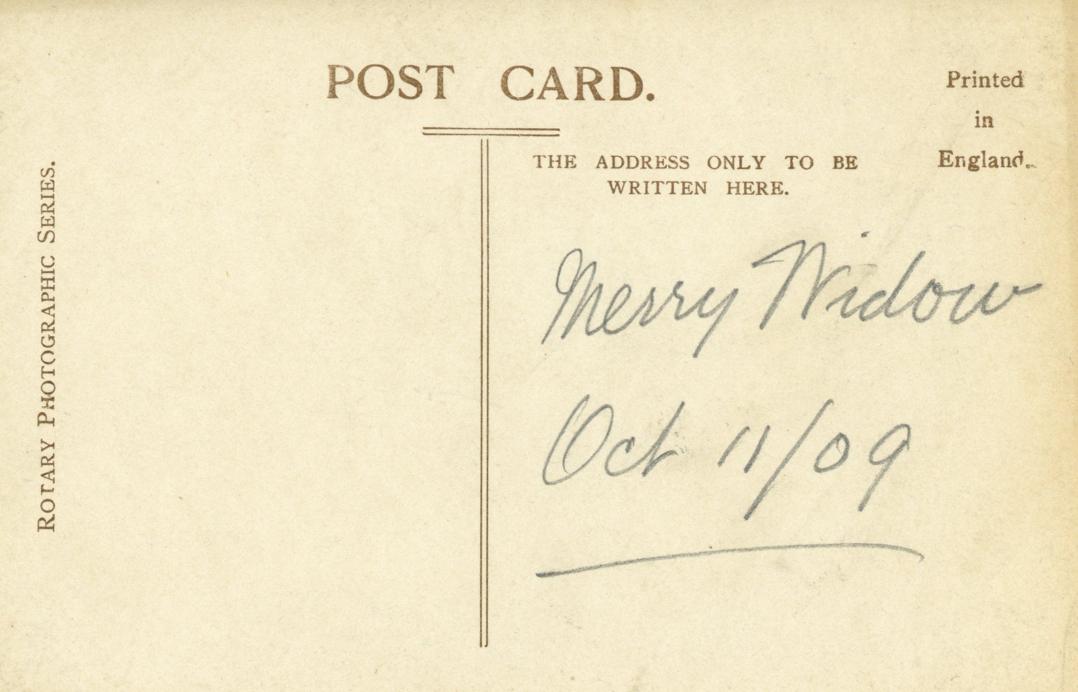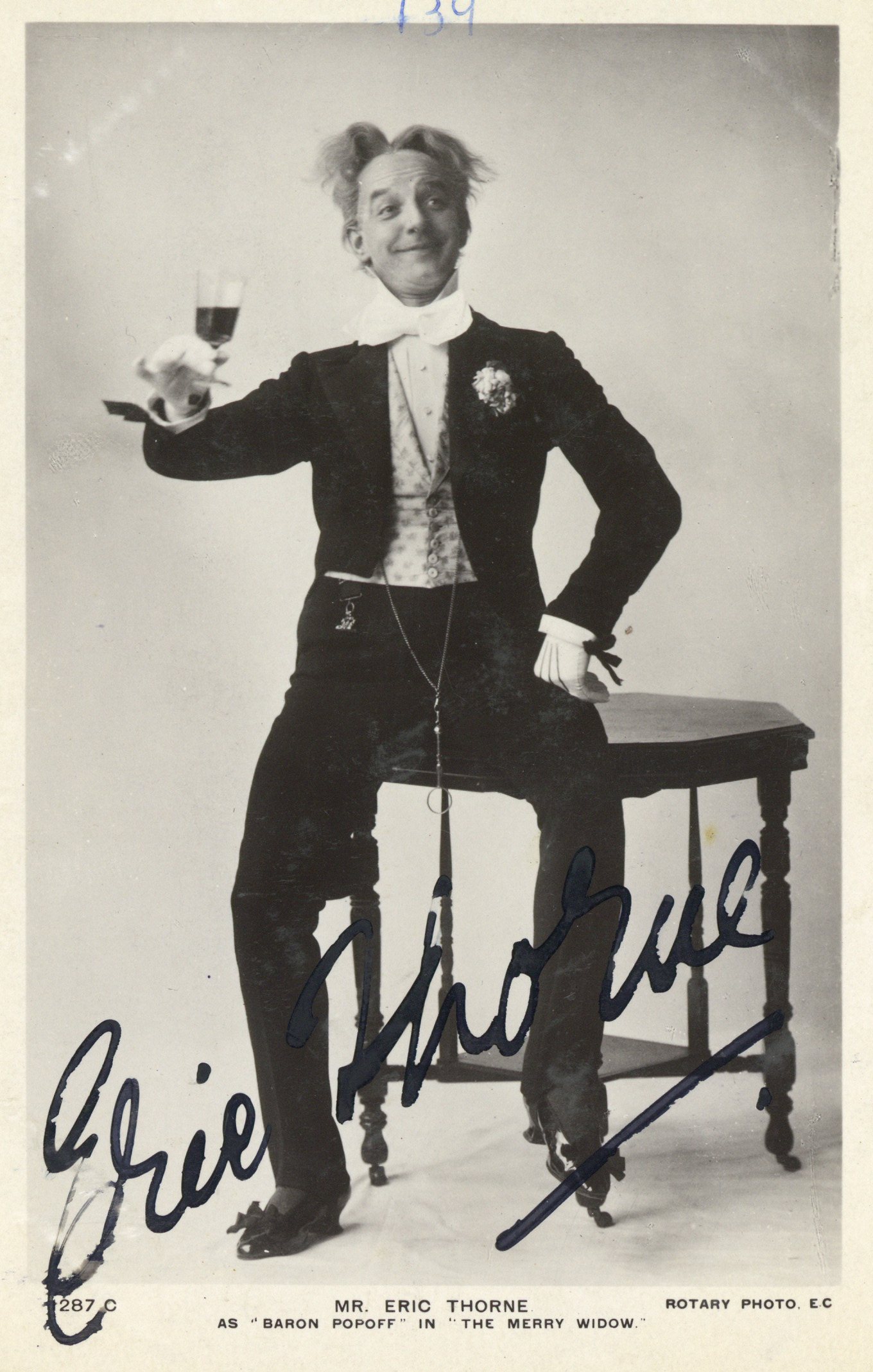 Promotional postcard of Eric Thorne, appearing in George Edwardes' touring production of The Merry Widow in 1909.