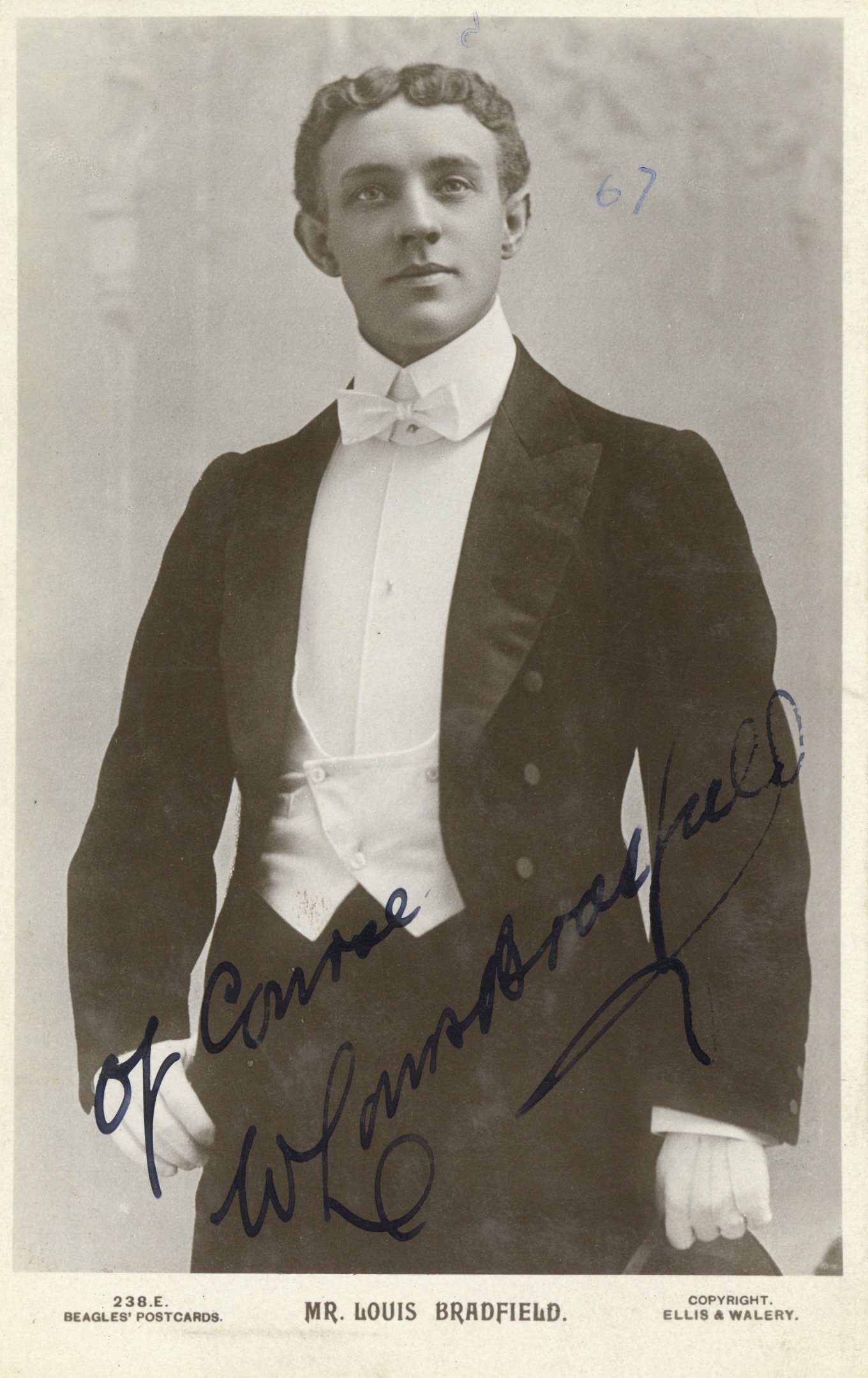 Louis Bradfield was a popular actor and singer, both in London and on tour. Bradfield’s first performance on stage was at the Theatre Royal Nottingham in 1889 in the Pantomime Sinbad the Sailor. Billed as W. Louis Bradfield he played Shipwreckeros.