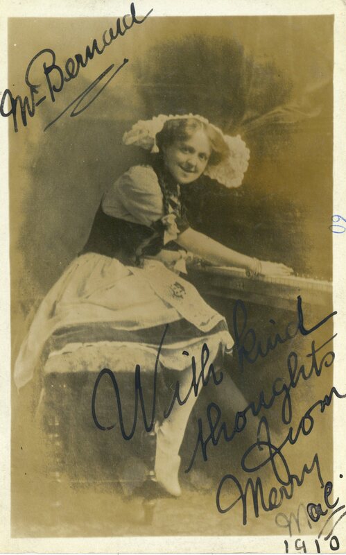 Promotional postcard of Mary Mae, appearing in Jack & Jill, the Theatre Royal Pantomime for 1909.