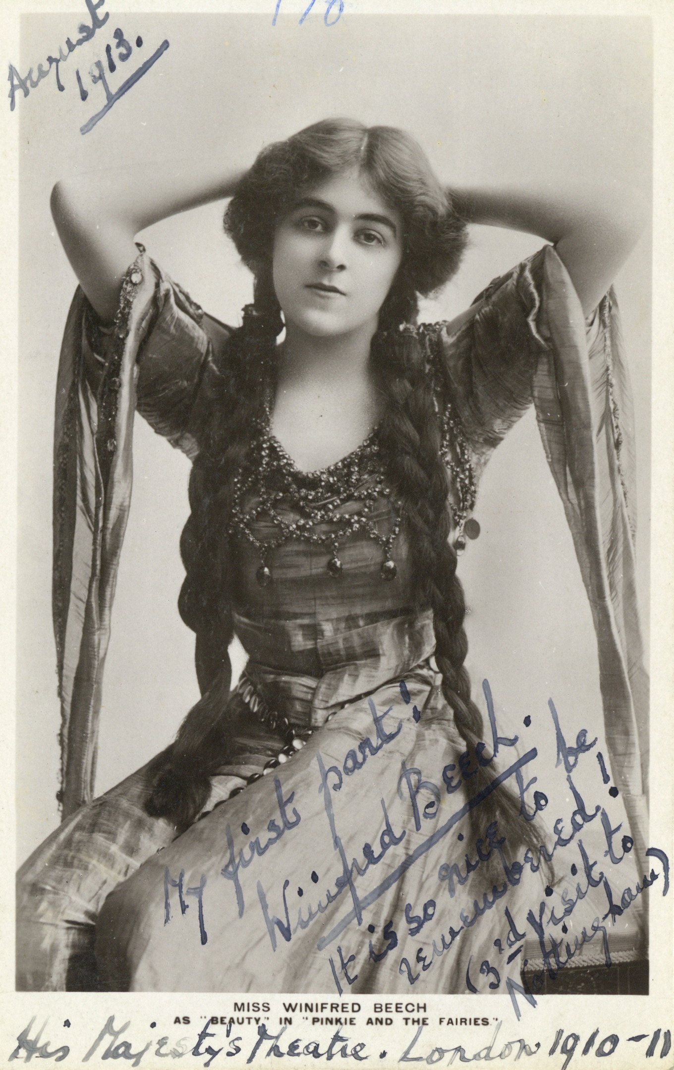 Although signed and dated in August 1913, this postcard actually depicts Beech in the role of Beauty in Pinkie and Faeries. Beech writes on the card that this was “My first part! Her Majesty’s Theatre, London 1910-11” Beech also writes, “It is so nice to be remembered! (3rd visit to Nottingham)”