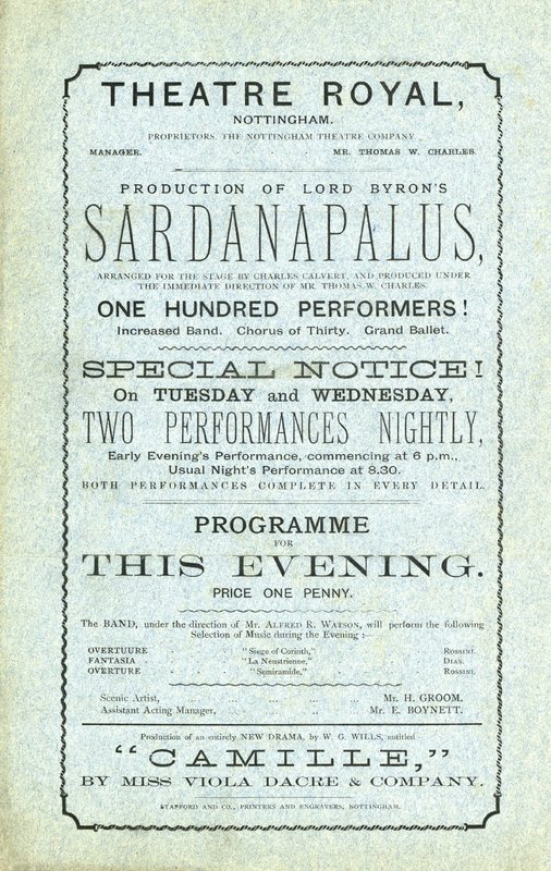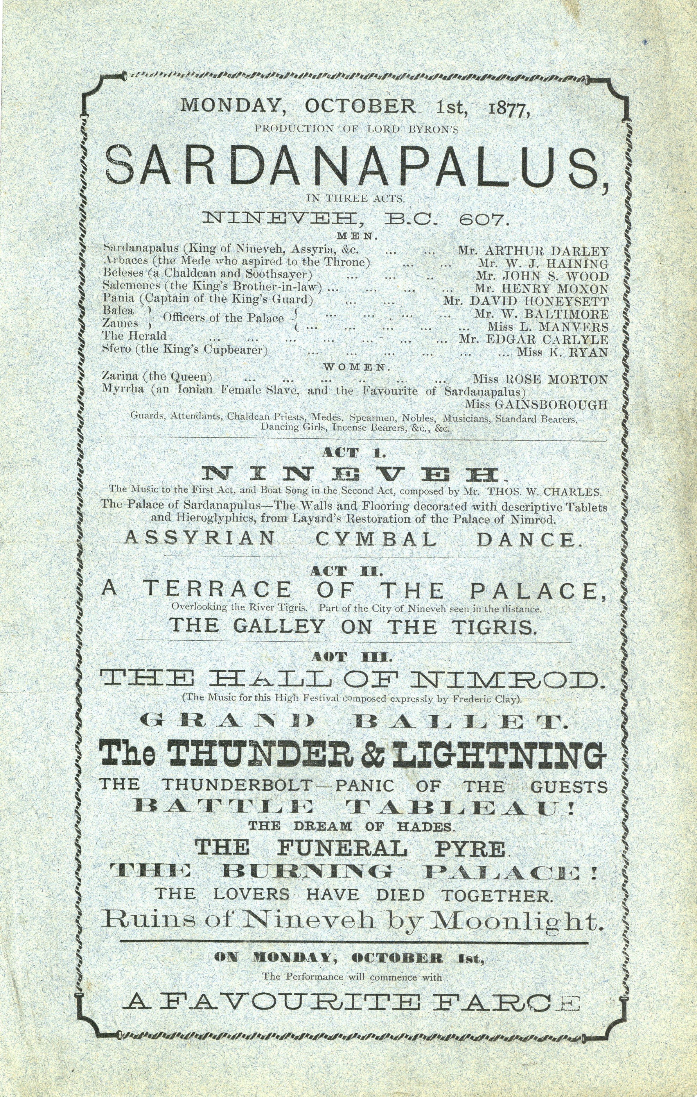 Two sided programme sheet for Lord Byron's Sardanapalus at the Theatre Royal in October 1877